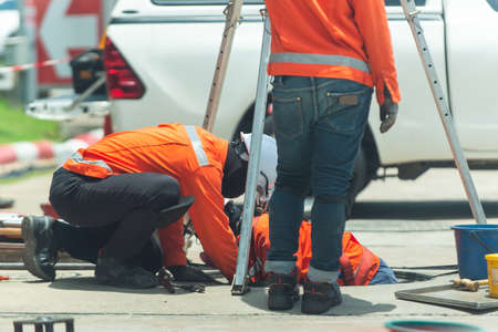 Group of construction workers working on road construction site. Selective focus.