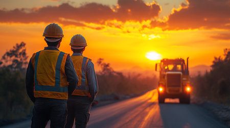 Two construction workers, seen from behind, wear hard hats and bright yellow high-visibility vests, observing a vibrant sunset over a road.