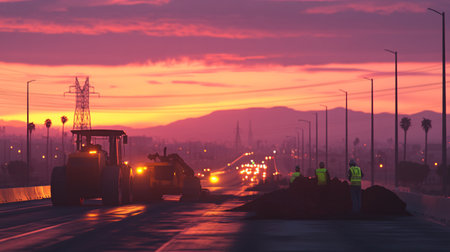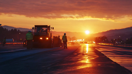 Sunset silhouette of road workers and machinery, capturing the end of a day dedicated to infrastructure improvement.