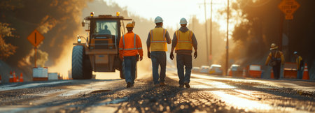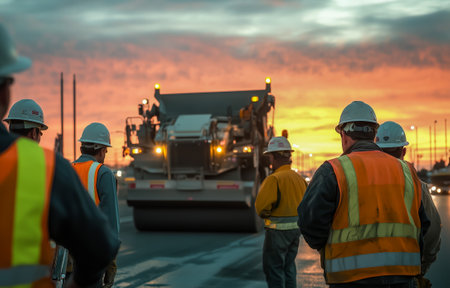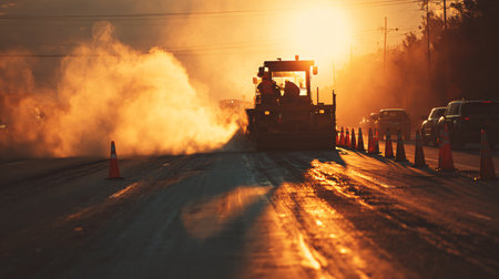 A Road construction team resurfacing asphalt with industrial paving equipment under warm morning light