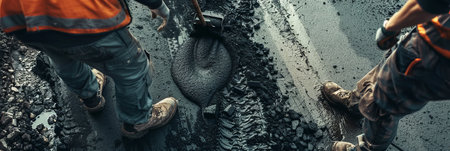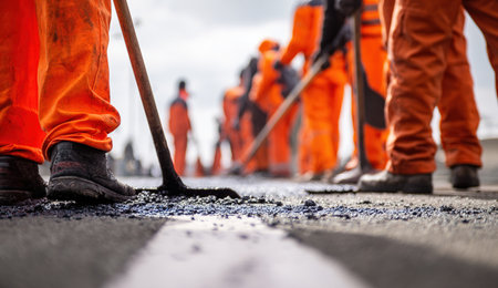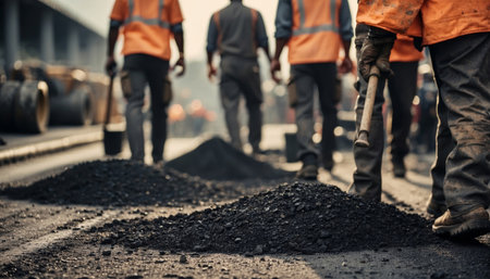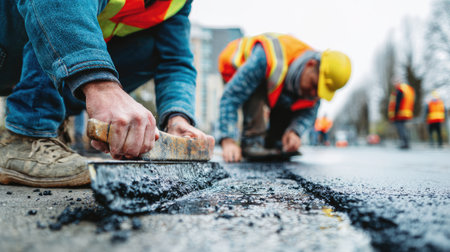 Workers are seen applying sealant to a dark asphalt road surface. They wear high-visibility vests and protective gear, suggesting a construction or repair project. The composition focuses on detail, with close-ups of tools and materials. Suitable for illustrating infrastructure, construction, or related commercial applications.