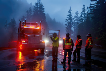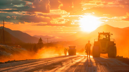 Workers in reflective vests manage road construction at sunset, creating a vibrant scene. The mountains provide a stunning backdrop to their diligent efforts.