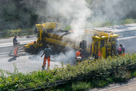 Process of asphalting and paving, asphalt paver machine and steam road roller during road construction and repairing works, workers working on the new road construction site, placing layer in summer