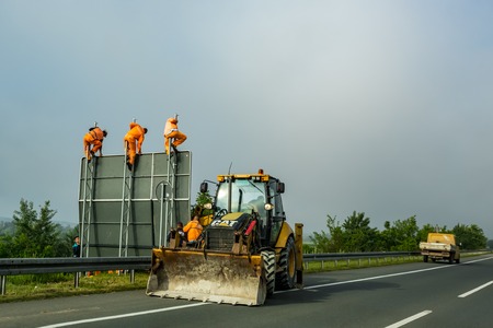 BELGRADE, SERBIA - MAY 15, 2017: Three men in orange work suits put up new traffic board sign on a newly reconstructed major road near Serbian capital city of Belgrade in a hazy day