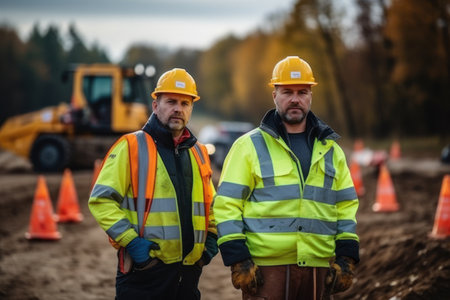 workers on the construction site wearing helmets and yellow vests. generative AI