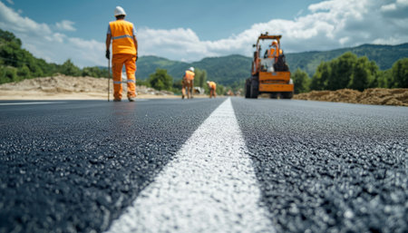 Workers applying lane markings on newly laid asphalt for road safety and traffic management