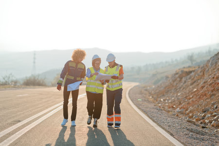 Team of engineers working on a road construction site. They are examining blueprints.