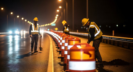 Road workers in yellow hard hats and safety vests work at night on a highway with orange traffic barrels. Headlights illuminate the wet asphalt.
