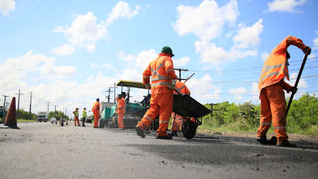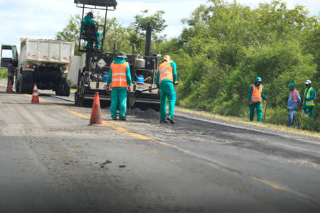 camacari, bahia, brazil - august 24, 2021: workers are seen doing an asphalt recap of the access lane to the industrial hub of the city of Camacari.