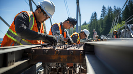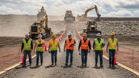 A team of diverse construction workers in hard hats and safety vests walking on a bridge. Construction equipment in the background.