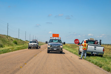 Brewster, NE, USA - July 15, 2019: Flagman with a stop sign and pilot car at road construction, travel and delay concept.
