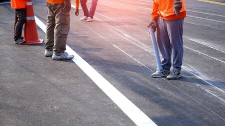 Low section of road workers group are working to marking line for painting traffic color lines on asphalt road with railway track crossing on street surface in the city, selective focus