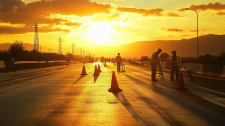 Construction workers are conducting surveying tasks at sunset on a highway. The orange sky creates an atmospheric backdrop for the activity, highlighting teamwork.