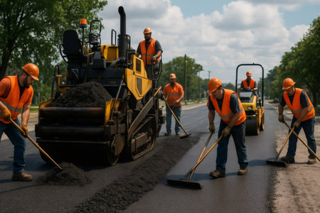 Construction workers spreading and compacting fresh asphalt on a road using machinery, creating a smooth new surface