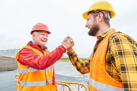 Architect and construction workers greet each other with a handshake on the road construction site
