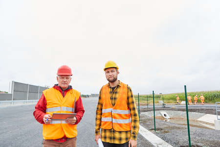 Two construction workers with tablet computers on the construction site in road construction in the new development area