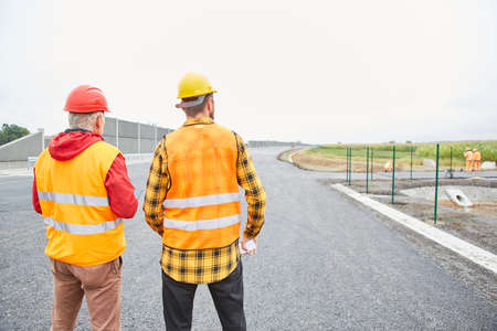 Men in construction helmets looking at the construction of the road