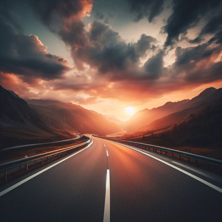 Dramatic sunset view over an empty desert road with vibrant colors and textures. The asphalt stretches into the horizon, inviting exploration and adventure.