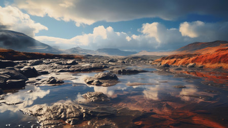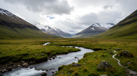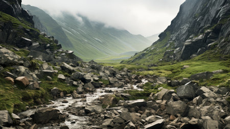 a stream meandering through a rocky mountain landscape, showcasing the beauty of hazy scottish scenery. this captivating photo captures the essence of post-apocalyptic backdrops, reminiscent of national geographic's stunning imagery. with a touch of windows xp nostalgia, the soft atmospheric perspective adds depth and allure, reminiscent of the works of renowned artist even mehl amundsen. ai generated