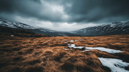 A stunning landscape featuring expansive grasslands, patches of snow, and dark, moody clouds looming over snow-capped mountains, evoking tranquility and adventure.