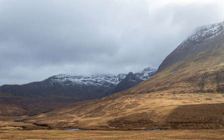 Rugged terrain with snowcapped mountains on the background on the Isle of Skye on the north of Scotland on a sunny spring day
