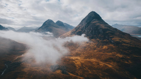 Captivating view of the Scottish Highlands featuring dramatic peaks shrouded in mist, lush valleys, and an atmospheric landscape perfect for nature lovers and photographers alike.