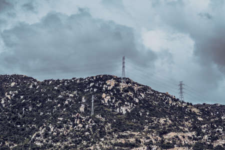 Real nature landscape background. Rocky mountain, cloudy Pale Blue dark stormy sky autumn day, high voltage Electricity power pylons. Cold mood feelings. Problem Difficult obstacles, discomfort