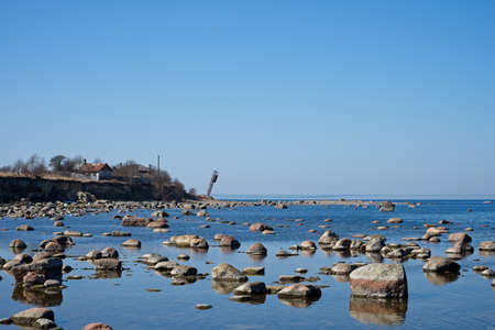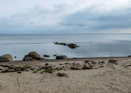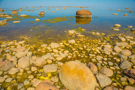 view of the unusual landscape of Kaltene beach, formed by large boulders covering the coast, morning hour, Kaltene rocky seashore, Latvia
