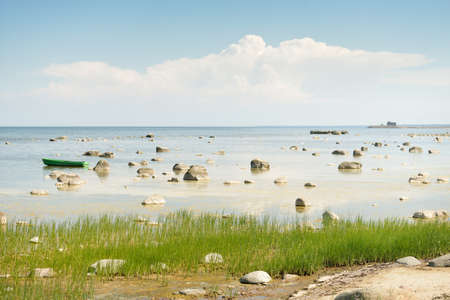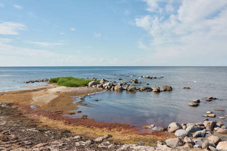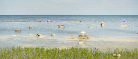 Baltic sea on a clear summer day, panoramic view from a sandy shore, stones close-up. Ruhnu island, Estonia. Nature, eco tourism, travel destinations, recreation themes