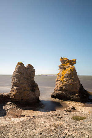 Sea Stacks at Gotland, Sweden with a clear blue sky.