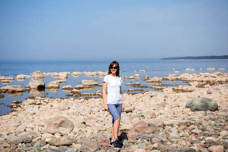 Panoramic view from the Baltic sea shore on a clear sunny summer day. Rocks close-up. Nature, environmental conservation, vacations, hiking, exploring concepts