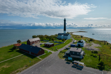 An aerial view of the Tahkuna Lighthouse located in the Tahkuna Peninsula, Hiiu Parish, on the island of Hiiumaa, in Estonia
