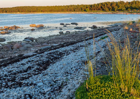 Rocky shore of the Baltic sea on a sunny day. Stones close-up. Green forest, fern, tree logs in the background. Ruhnu island, Estonia. Summer vacations, travel, environmental conservation theme