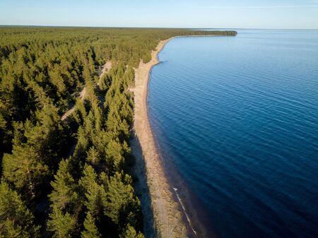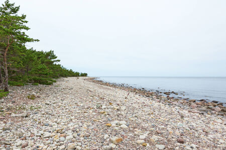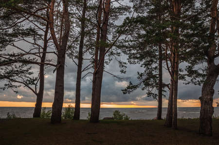 Pine trees in the forest by the sea. Classical Baltic beach landscape. Wild nature