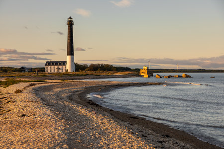Saaremaa, Estonia - August 24, 2021: The black and white Sorve lighthouse stands tall on a grassy field near the Baltic Sea coast on Saaremaa island.