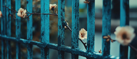 A captivating view of lush greenery and vibrant blossoms seen through iron bars. The image captures sunlight filtering through foliage, creating a soft, dreamy atmosphere.