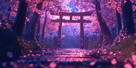Enchanting Torii Gate Framed by Ethereal Cherry Blossoms in a Tranquil Japanese Landscape at Dusk The Serene and Spiritual Atmosphere Creates a Dreamlike Awe Inspiring Scene