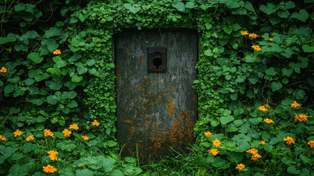 A weathered wooden door framed by lush greenery and vibrant orange flowers hints at a secret passage in a hidden world.
