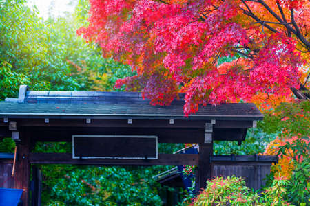 Landscape of Itchiku Kubota art museum gate nearby Kawaguchiko lake, Japan in the autumn season.
