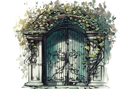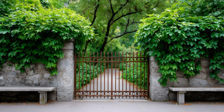 ornate iron gate opening to a hidden path, created with generative ai