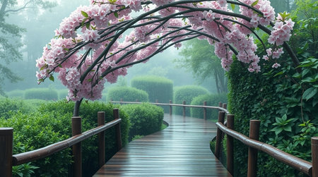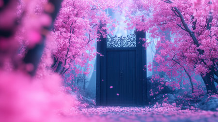 serene scene featuring dark wooden gate surrounded by vibrant pink cherry blossom trees, creating magical and tranquil atmosphere. soft focus enhances dreamlike quality of this enchanting landscape.