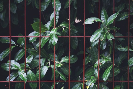 Part of old black metal fence overgrown with leaves background