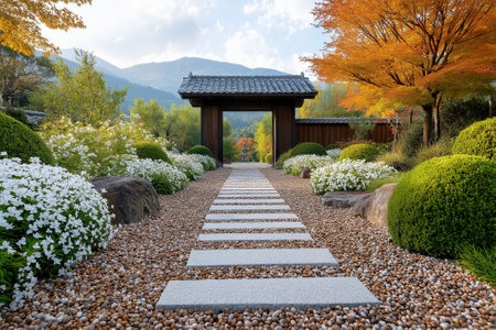 shinto shrine gate at the end of a stone pathway, created with generative ai