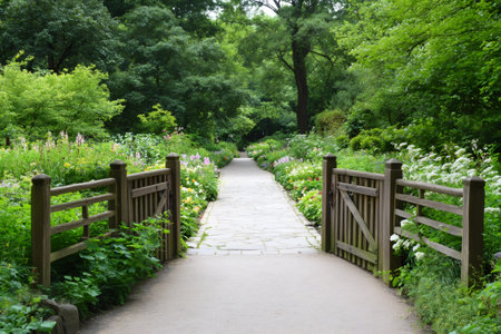 This captivating image showcases a scenic pathway framed by lush green trees, with an inviting open gate welcoming visitors to explore the tranquil park setting.