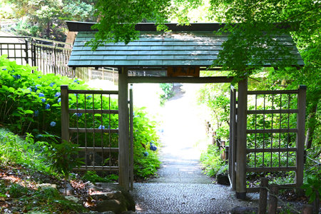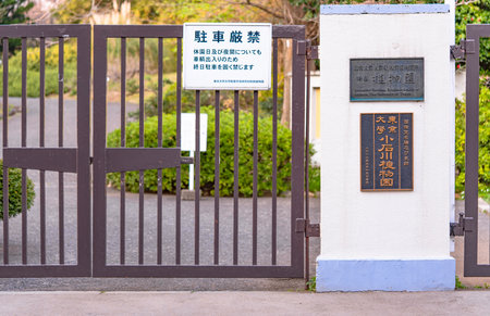 tokyo, japan - march 20 2020: Close-up on entrance gate of the Koishikawa Botanical Gardens with the plate of the graduate school of science of the university of tokyo on the wall.