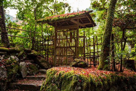 Traditional zen buddhist Daihikaku Senkoji Temple in Arashiyama mountain area. Rustic japanese minimal landscape.