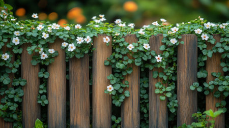 A rustic wooden fence is covered with lush green leaves and delicate white flowers, creating a serene and inviting atmosphere in a tranquil outdoor environment.