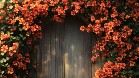 A stunning arrangement of vibrant orange flowers surrounds a rustic wooden wall, creating a warm and inviting ambiance. Perfect for nature-themed projects.