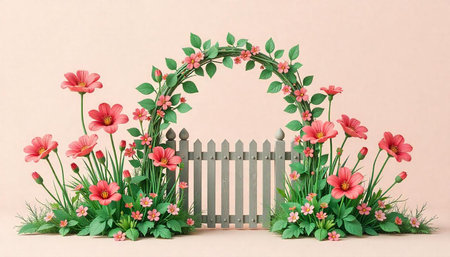 Floral garden gate with archway and pink cosmos flowers