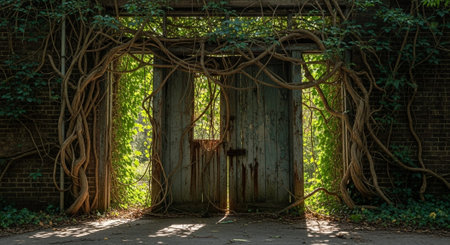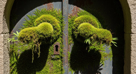 faded wooden door is partially obscured layers of moss and vibrant green vines in lush, overgrown forest garden